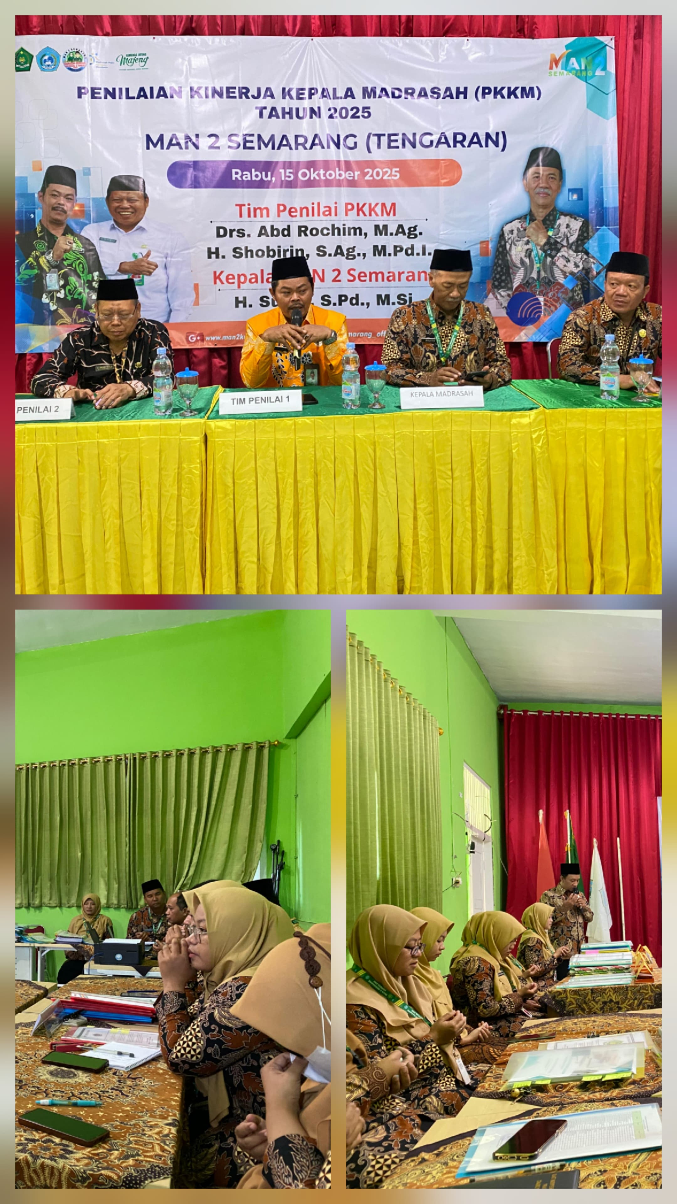 Pelaksanaan kegiatan Penilaian Kinerja Kepala Madrasah (PKKM) di MA Negeri 2 Semarang Tahun 2025 berlangsung dengan tertib dan khidmat. Acara diawali dengan kegiatan seremonial yang dimulai dengan bacaan basmallah, dilanjutkan dengan doa bersama sebagai bentuk permohonan kelancaran dan keberkahan dalam pelaksanaan kegiatan ini.Kemudian, acara dilanjutkan dengan sambutan dari Kepala MA Negeri 2 Semarang, H. Sujito, S.Pd., M.Si., yang menyampaikan terima kasih atas kehadiran tim penilai serta menjelaskan secara singkat berbagai capaian dan inovasi yang telah dilakukan selama masa kepemimpinannya. Beliau juga menegaskan komitmennya untuk terus meningkatkan mutu pendidikan dan layanan di madrasah.Selanjutnya, tim penilai yang terdiri dari dua orang turut memberikan sambutan. Penilai 1, H. Shobirin, S.Ag., M.Pd.I., menyampaikan pentingnya PKKM sebagai sarana evaluasi dan peningkatan mutu kepemimpinan kepala madrasah. Penilai 2, Drs. H. Abd. Rochim, M.Ag., menambahkan bahwa PKKM bukan hanya sebagai bentuk penilaian administratif, tetapi juga refleksi untuk pengembangan madrasah secara berkelanjutan.Setelah sambutan, kegiatan inti pun dimulai, yaitu proses penilaian kinerja kepala madrasah. Penilaian ini mencakup berbagai aspek kepemimpinan, manajerial, supervisi akademik, kewirausahaan, dan kepribadian kepala madrasah yang dilakukan secara objektif dan menyeluruh oleh kedua tim penilai.Menjelang akhir acara, kegiatan ditutup dengan pesan dan kesan dari tim penilai, di mana keduanya memberikan apresiasi atas kinerja kepala madrasah dan seluruh civitas MA Negeri 2 Semarang yang telah mendukung proses PKKM dengan baik. Dilanjutkan dengan penyerahan hasil penilaian secara simbolis dan penandatanganan berita acara penilaian oleh Kepala Madrasah dan kedua tim penilai.Sebagai penutup, dilakukan foto bersama sebagai dokumentasi dan simbol kebersamaan dalam upaya meningkatkan mutu pendidikan di MA Negeri 2 Semarang.Semoga keberhasilan pelaksanaan PKKM tahun 2025 ini menjadi momentum untuk terus meningkatkan kualitas dan kuantitas layanan pendidikan di MA Negeri 2 Semarang, sehingga ke depan, MA Negeri 2 Semarang semakin cemerlang, unggul, dan berdaya saing tinggi.